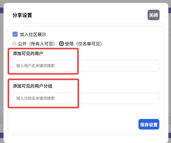 在受限分享模式下,可以设置具体哪些用户可见,可按姓名或者用户分组分享: