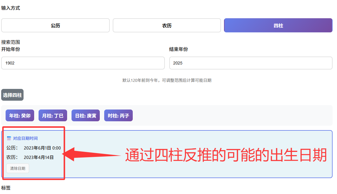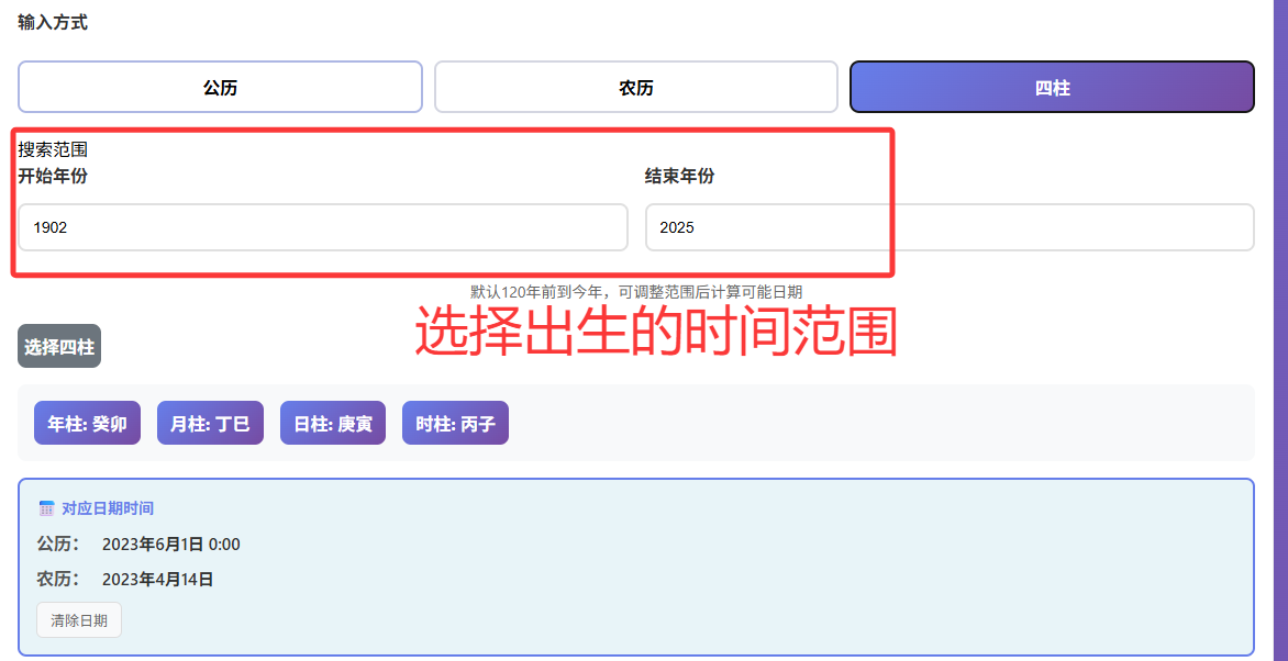 下面重点说一下从四柱输入的方式,由于四柱可能对应不同出生日期,因此输入四柱的时候,要选择日期范围,防止反推出现多个结果: