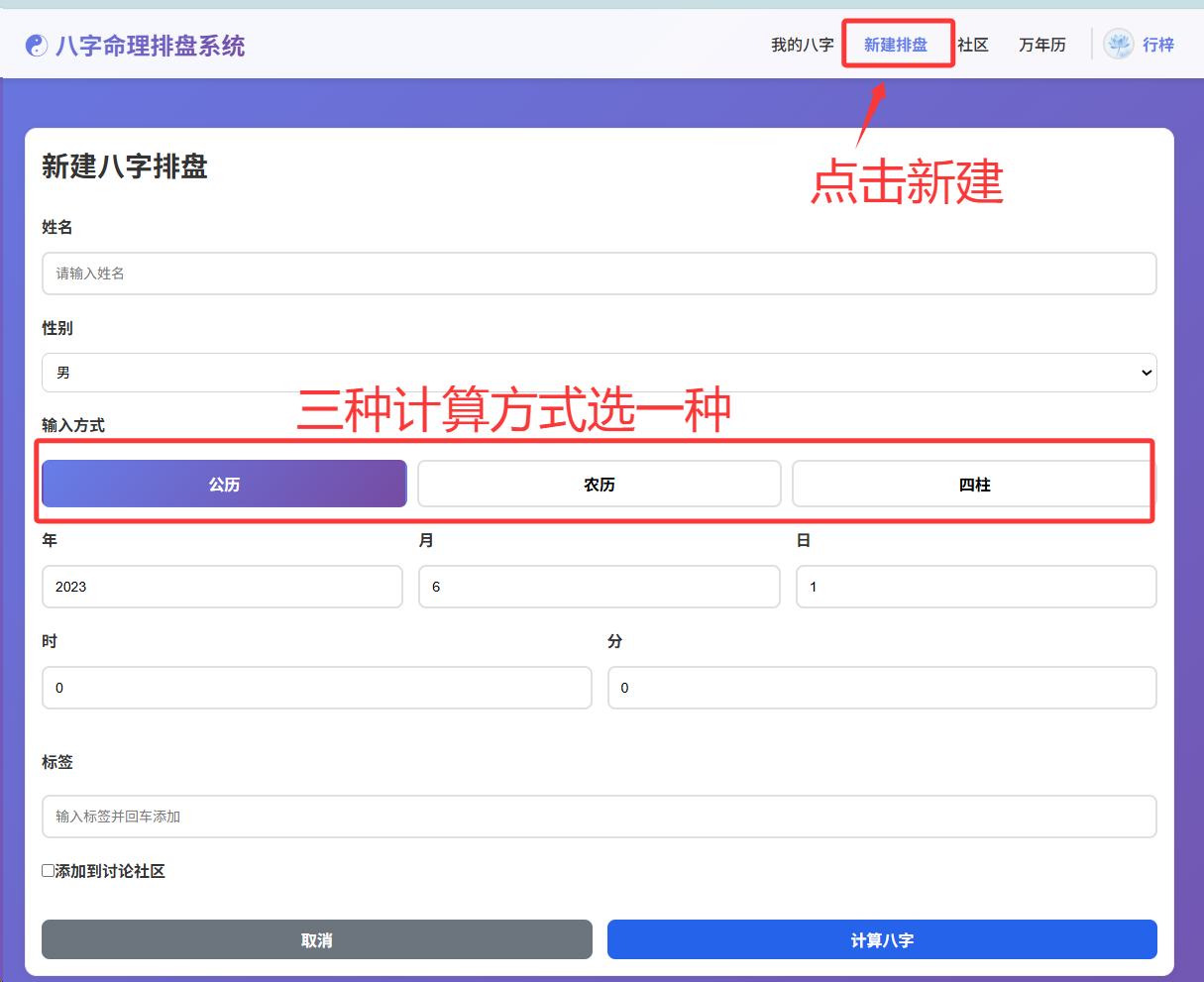 点击导航栏新建八字排盘,进入新建排盘页面,输入姓名、性别、以及八字计算方式,可以从阳历、农历输入计算八字,也可以从四柱直接输入:
