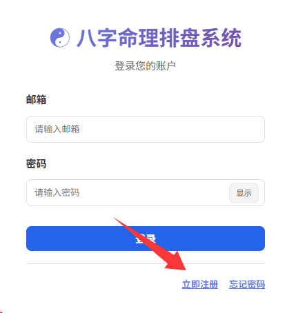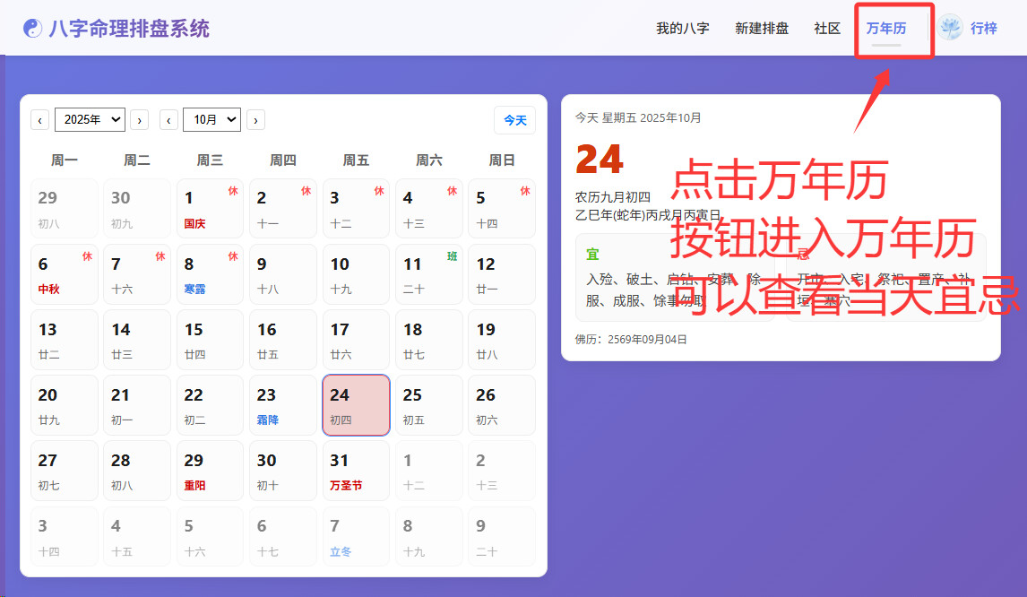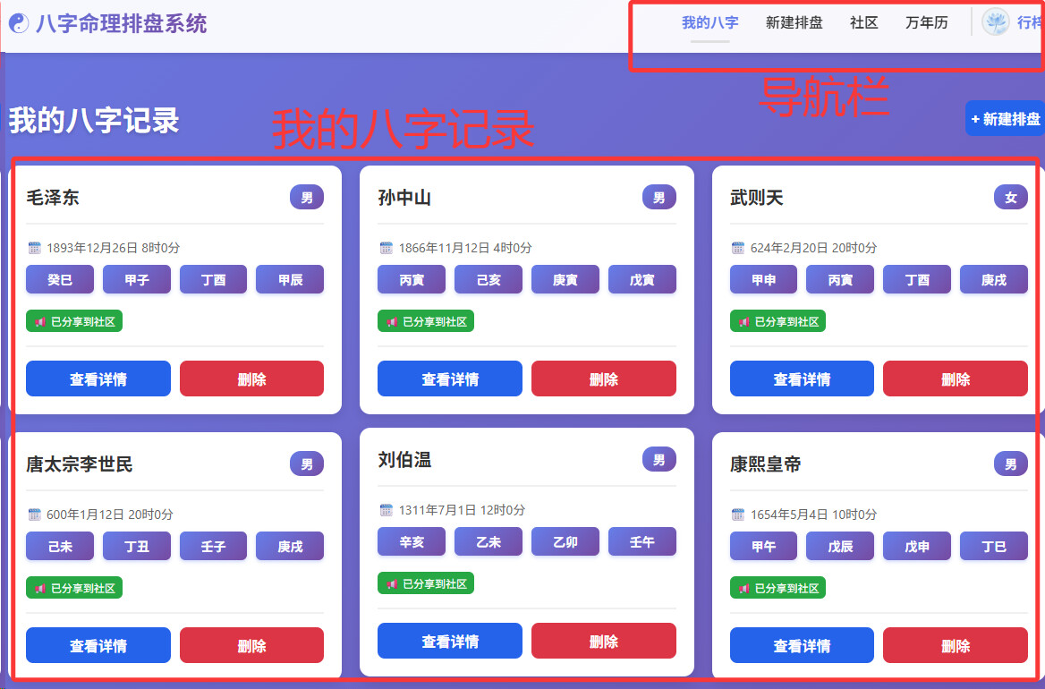 登录进入网站主页,上面是导航栏,包含可用的页面选项,然后就是“我的八字记录”: