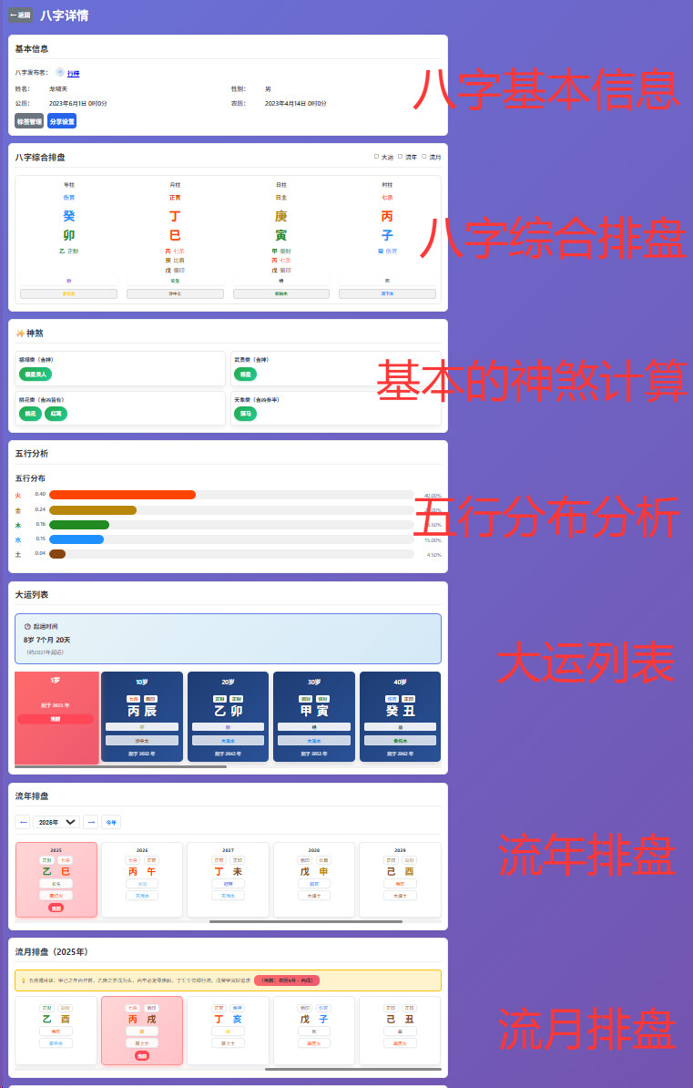 1、八字排盘(含十神、神煞、大运、流年等)及八字存储搜索功能;