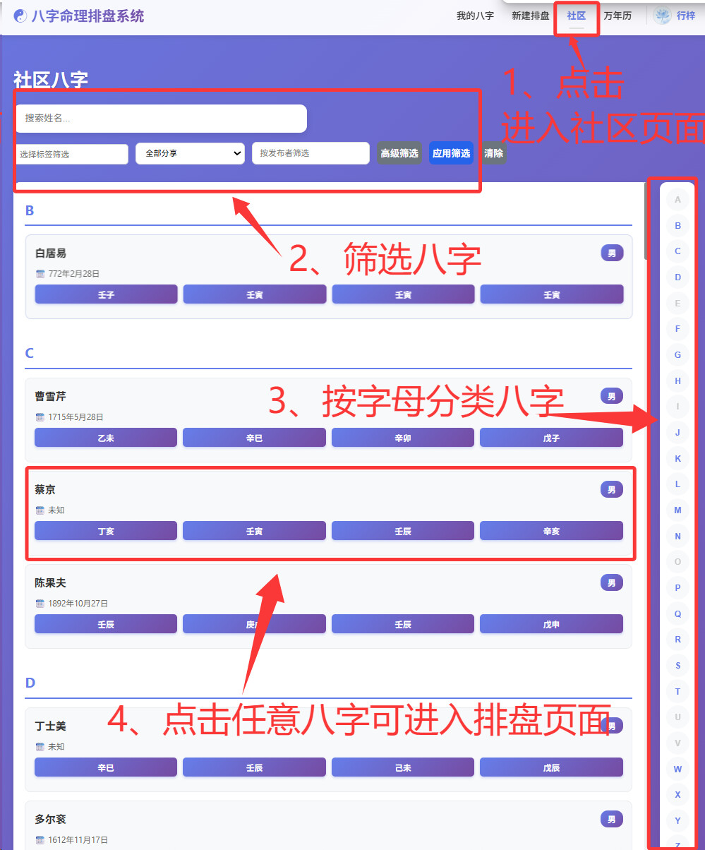 然后在社区就能看到他人分享的八字,可以根据姓名、标签、分享方式、发布者(高级筛选可以筛选出生时间、具体天干地址等)进行筛选: