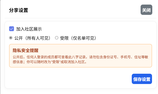 如果你是用的仍然在世的人的八字,为了保护隐私,在分享设置页面中,可以设置公开,或者限制分享: