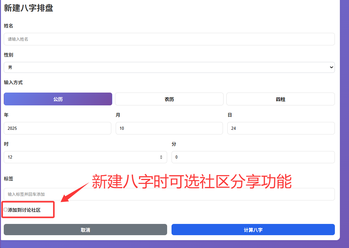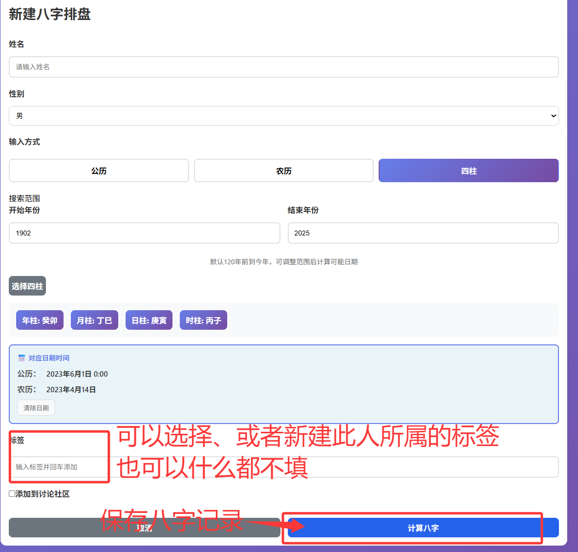 还可以把这个八字分类到某个标签中 ,也可以不填,最后要点击“计算八字”保存这个八字记录: