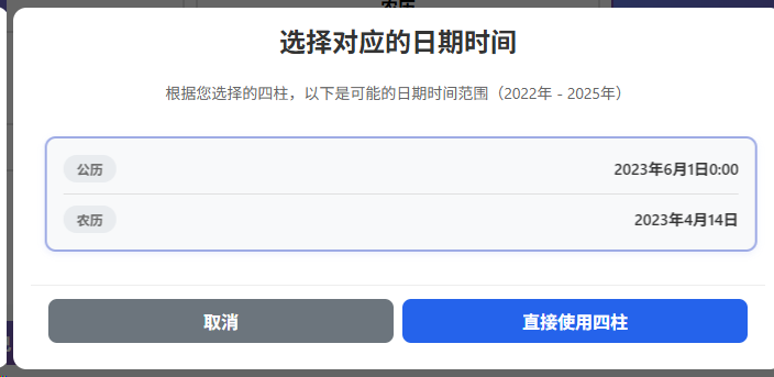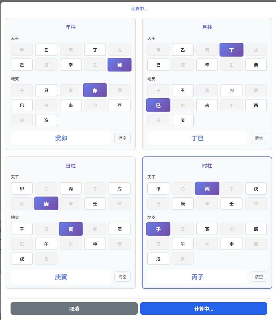 点击“选择四柱”会出现四柱输入页面,直接点选输入年月日时的干支: