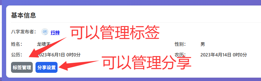 其次,在八字详情页面的基本信息栏,可以设置八字标签以及分享设置: